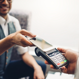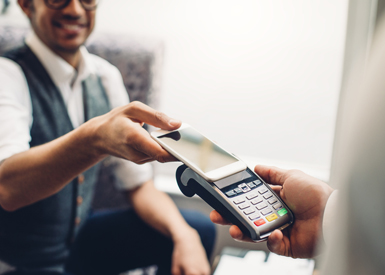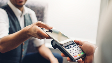 A person uses a smartphone to make a contactless payment on a POS terminal, illustrating secure and convenient digital and mobile payment technology in a professional setting.